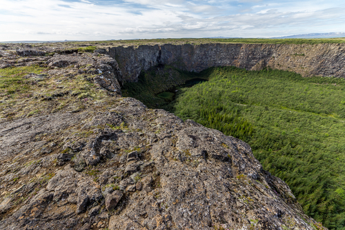 Asbyrgi Canyon in the northern tip of the vast Vatnajokull national park, is a spectacular horseshoe shaped canyon, 3 km long and 1 km wide, with surrounding 100 meters high cliffs.
