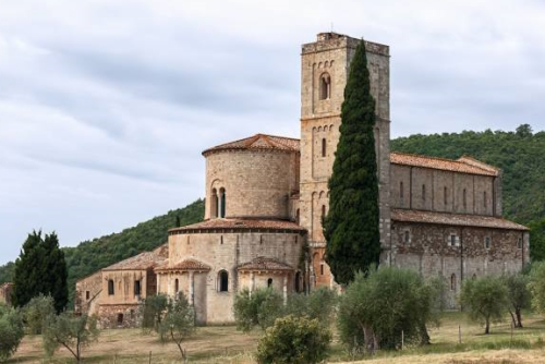 An impressive and beautiful 12th century French Romanesque architecture, isolated between Olive groves and Wheat fields, 10 km south of Montalcino.