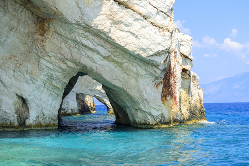 Overwhelming limestone sea caves and natural arches cut out of the cliffs falling to sea in Cape Skinari, on the northern tip of the island, 35 km northwest of Zakynthos town. Take a boat tour to explore, swim and dive into the beautiful blue caves reflecting the light from the sky and sea. Boat tours with Glass floor are available from Agios Nikolaos and from the town of Zakynthos as part of an island all around boat tour.